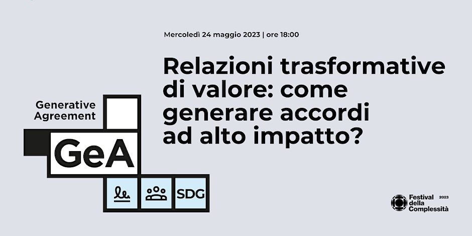 GeA è un accordo tra due o più parti che intendono formalizzare la co-creazione di valore tangibile ed intangibile, realizzato con l’obiettivo di generare un impatto positivo sulla società e sulla biosfera.