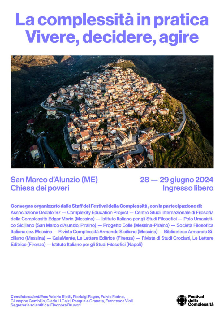 Il convegno, dal titolo “La complessità in pratica. Vivere, decidere, agire”, si terrà il 28 e 29 giugno 2024 a San Marco d’Alunzio (ME) presso la Chiesa dei poveri: nei due giorni si alterneranno accademici, operatori sanitari, psicoterapeuti e studiosi di sistemi complessi, per parlare dell’applicazione pratica della complessità in diversi ambiti: filosofia, scienze, psicologia, medicina, management, educazione.