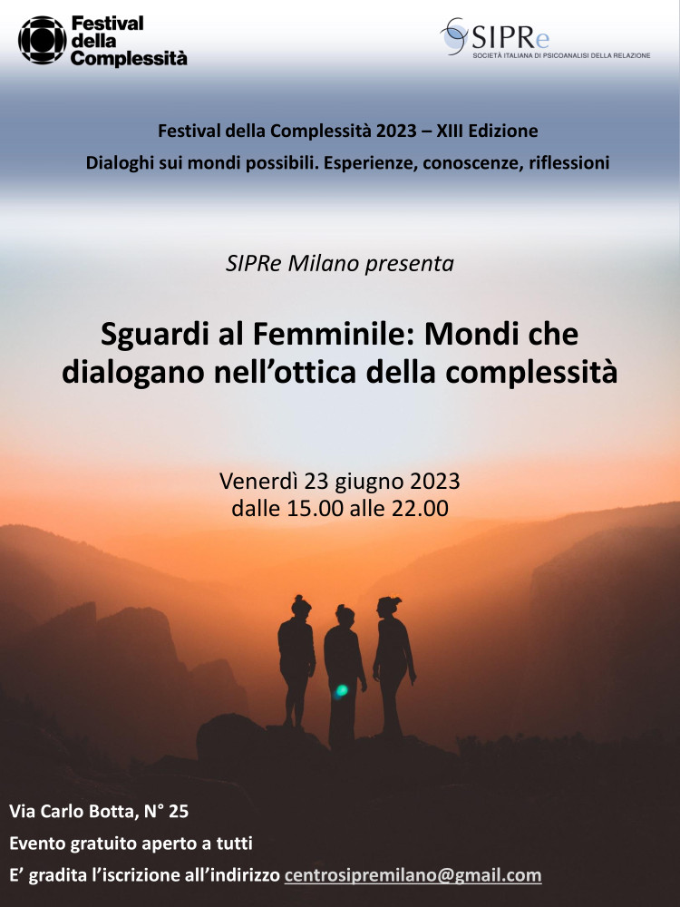 Il Centro SIPRe di Milano organizza un evento nella giornata del 23 giugno 2023 dalle ore 15.00 alle ore 22.00 presso la sede di Via Carlo Botta 25 Milano (MI). La partecipazione all’evento è gratuita, aperta a tutti al di là della propria formazione professionale. Il nostro intento è quello di far dialogare mondi e menti sul tema del femminile nell’ottica della complessità: letteratura, cinema, poesia, fotografia e arti espressive, medicina e salute mentale.